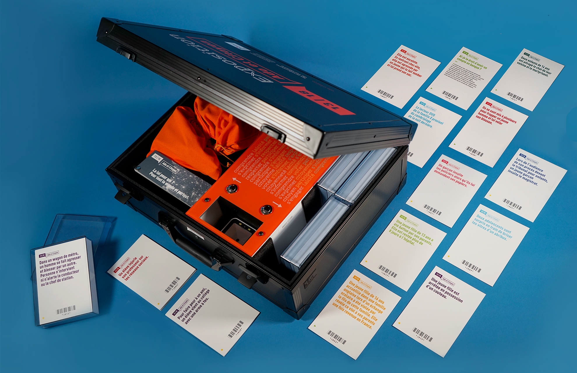 La mallette se compose d’un ordinateur, un scanner, des hauts parleurs et un jeu de 99 fiches munies de code barre. Les fiches-questions sont choisies par les adolescents, et après mise en discussion collective, elles s’affichent sur l’écran, illustrées d’un micro-film ou d’une animation graphique suivis des réponses légales.